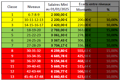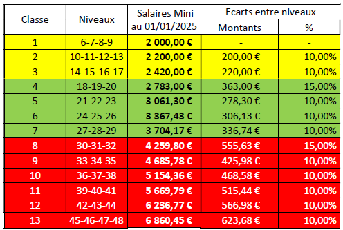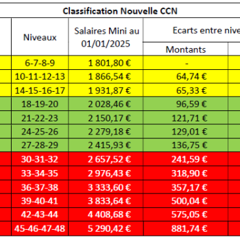 La nouvelle grille de minima de salaires qui sera donc obligatoirement mise en place au 1er janvier 2026 a certes augmenté les écarts entre niveaux par rapport aux anciennes grilles mais cela reste insuffisant puisque les écarts entre niveaux des non-cadres ne dépassent pas les 6%, ce qui ne permet pas la reconnaissance des compétences et les efforts fournis pour la promotion sociale.