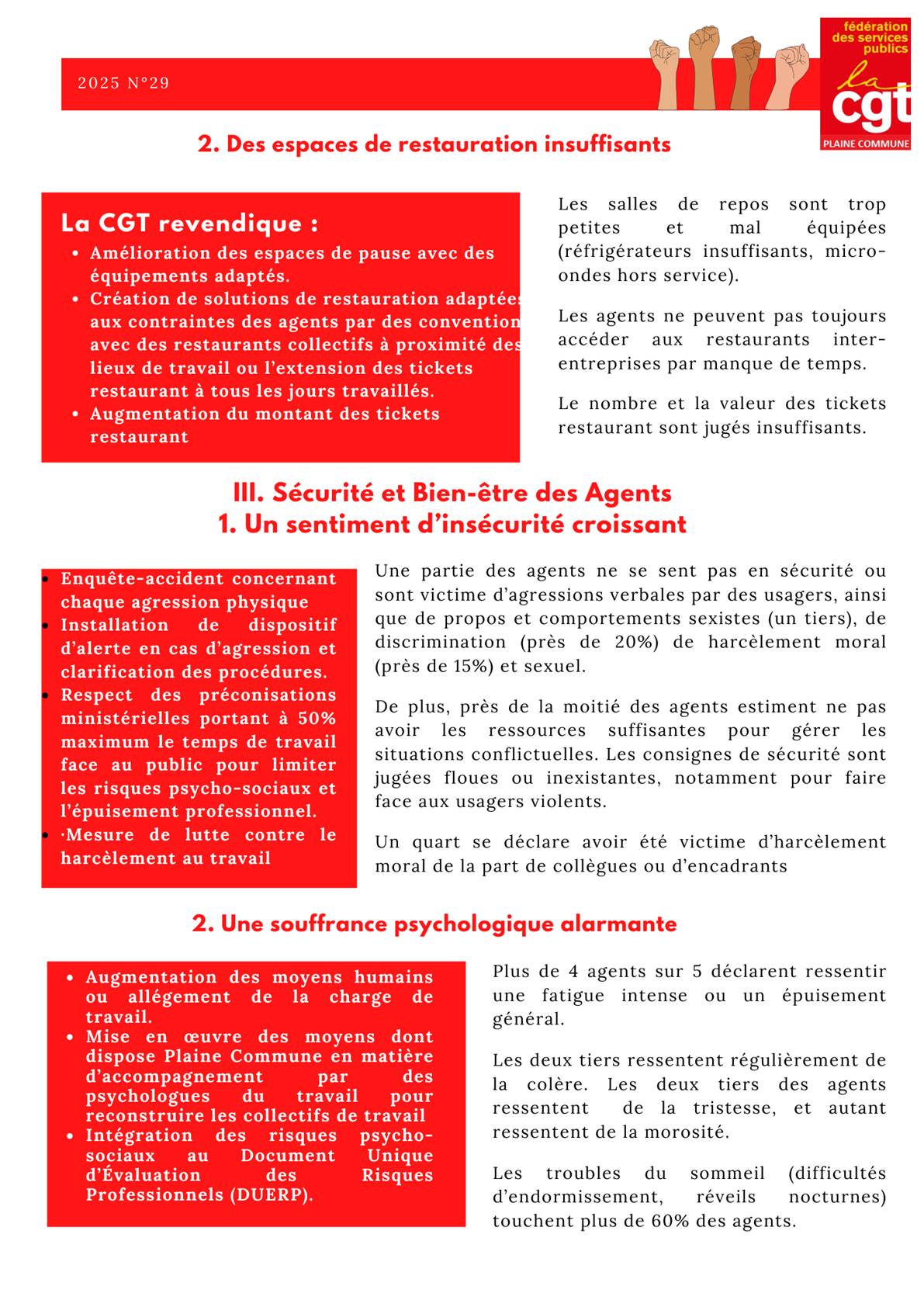 Or, les agentEs, qui ont témoigné en grand nombre de leurs souffrances et de leurs difficultés liées au travail à Plaine Commune, lors des entretiens et de l’enquête, ont des revendications.