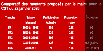 Le Maire a transmis sa proposition de participation employeur à la mutuelle santé pour le CST du 22 janvier 2026 suite à l’intervention de la CGT. Cela aurait dû être fait en 2025 car application au 1er janvier 2026 ! A noter de nouveau, un dossier reçu or délai !
