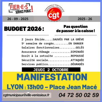 69 | Syndicat CGT de Vénissieux - Manifestation à Lyon 13h00 le 2 octobre 2025