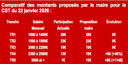 Le Maire a transmis sa proposition de participation employeur à la mutuelle santé pour le CST du 22 janvier 2026 suite à l’intervention de la CGT. Cela aurait dû être fait en 2025 car application au 1er janvier 2026 ! A noter de nouveau, un dossier reçu or délai !