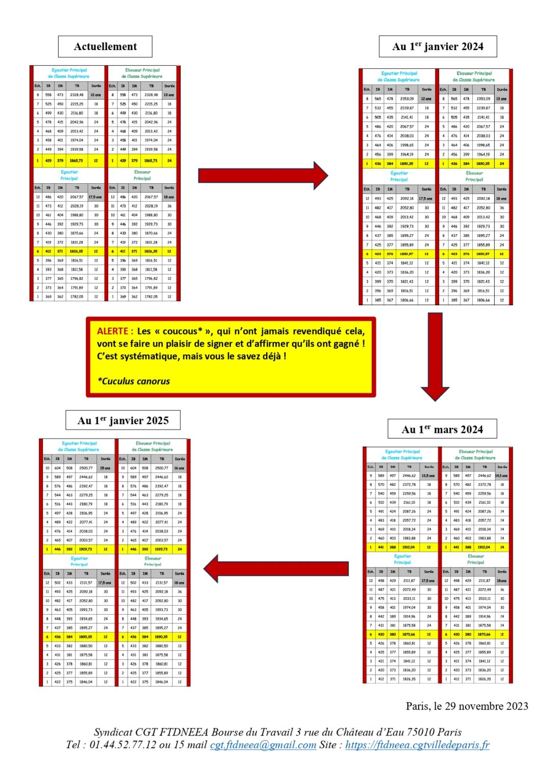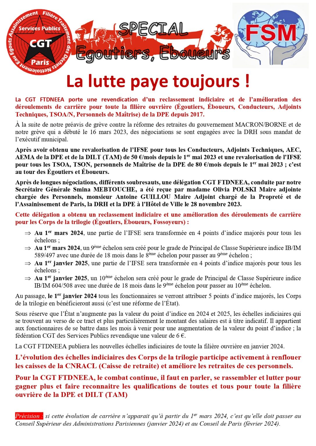 Après de longues négociations, différents soubresauts, une délégation CGT FTDNEEA, conduite par notre Secrétaire Générale Smina MEBTOUCHE, a été reçue par madame Olivia POLSKI Maire adjointe chargée des Personnels, Monsieur Antoine GUILLOU, Maire Adjoint chargé de la Propreté et de l’Assainissement de Paris, la DRH et la DPE à l’Hôtel de Ville le 28 novembre 2023. Cette délégation a obtenu un reclassement indiciaire et une amélioration des déroulements de cardère pour les Corps de la trilogie (Égoutiers, Éboueurs, Fossoyeurs).