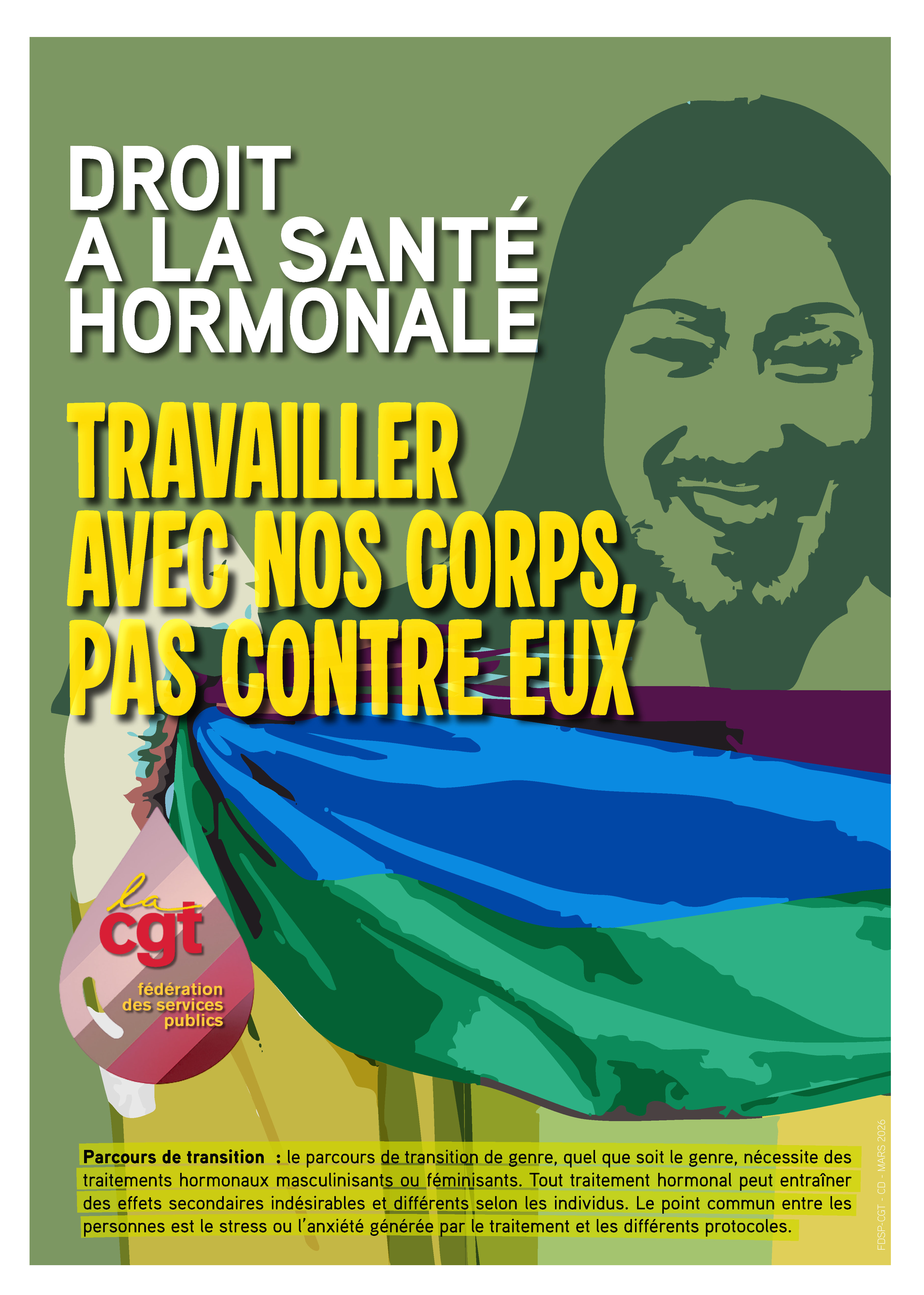 La CGT revendique un droit à la santé hormonale. Ce droit se veut le plus inclusif possible pour lutter contre toutes les formes de discriminations et d’exclusions. C’est une revendication progressiste et innovante qui permet d’aborder des sujets encore tabous mais bien présents et de prendre en compte les spécificités de genre et d’inclure le maximum d’agent∙es.